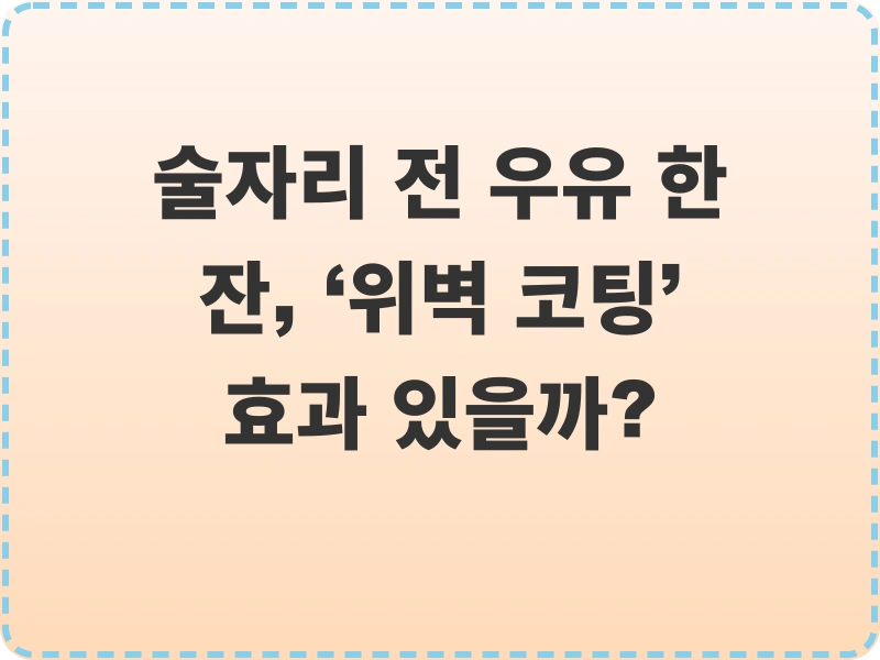 술자리 전 우유 한 잔, ‘위벽 코팅’ 효과 있을까?2024년 1월 26일즐거운 술자리를 앞두고, 혹시 "술 마시기 전에 우유를 마시면 위벽을 보호해준다"는 이야기를 들어보신 적 있으신가요? 많은 분들이 술자리 전에 우유를 마시는 것이 습관처럼 되어있기도 합니다. 정말 효과가 있는 걸까요? 오늘은 술자리 전 우유 섭취의 진실과 함께, 건강하게 술을 즐기는 방법에 대해 자세히 알아보겠습니다.술자리 전 우유, 정말 위벽을 코팅해줄까?결론부터 말씀드리자면, 우유가 위벽을 ‘코팅’해주는 효과는 과학적으로 입증된 바 없습니다. 우유는 위산 분비를 억제하고 위 점막을 보호하는 효과가 있을 수 있지만, 이것이 마치 ‘코팅’처럼 완벽하게 위벽을 보호해주는 것은 아닙니다. 오히려 우유 속의 칼슘과 단백질은 위산 분비를 ..